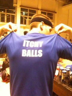 Edit by Troy: Ok, a little context here would probably be helpful. Our team is named Untouchaballs, and we all have names that include "balls" and corresponding shirts. I was going to be Chuck Balls (because I'm fierce on the court like Chuck Norris, and chucking balls is what I do), but Sierra and I opted for the darling duo of Itchy Balls and Scratchy Balls. Dodgeball is entirely an expat affair... I doubt the young adults in China had the requisite exposure to the "sport" in their formative years.