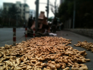We never know what we're going to see as we stroll from place to place. Last week, it was piles of ginger spread over the sidewalk outside a vegetable market.