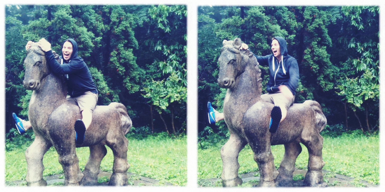 I had to bully Troy into climbing aboard this statue, but it was worth